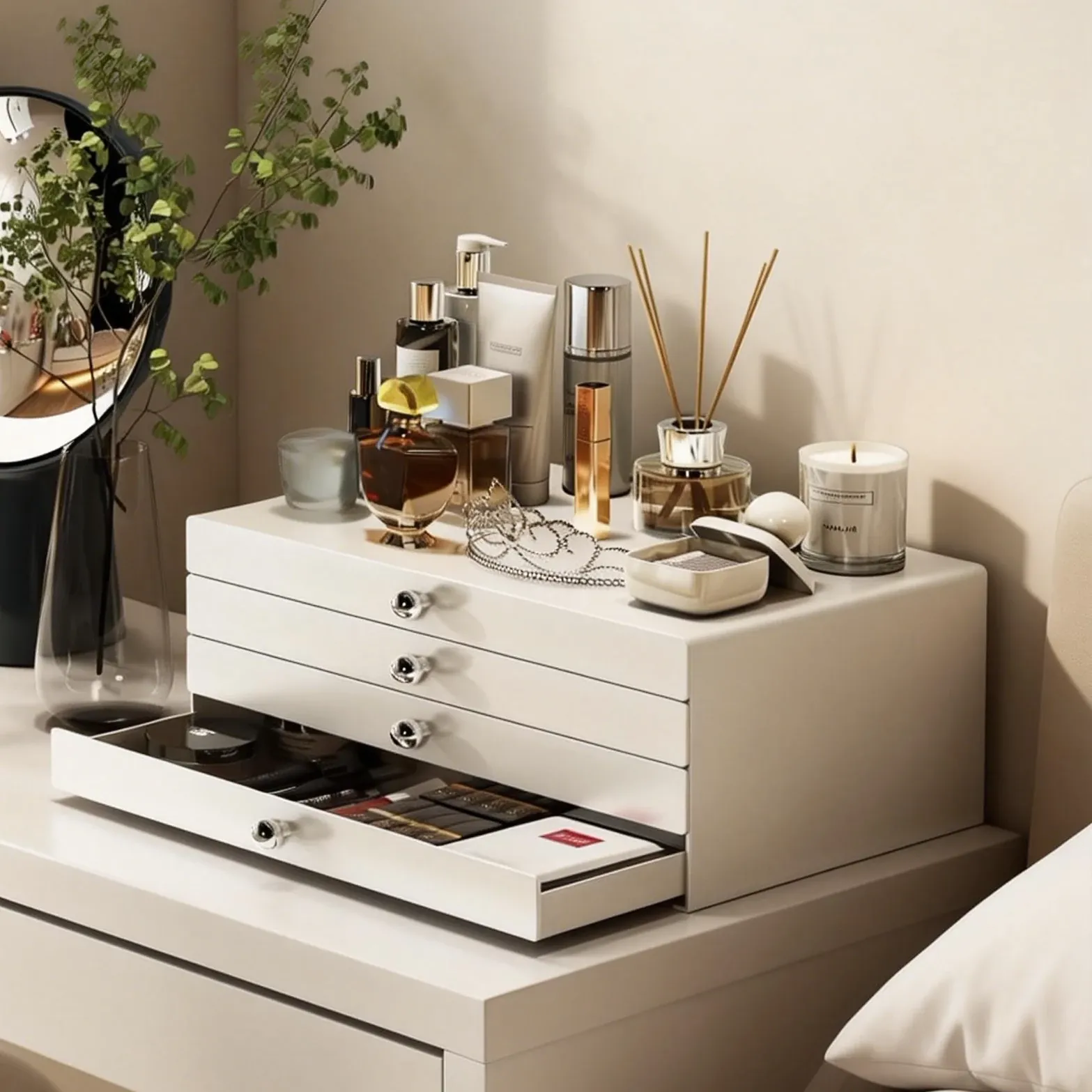 デコハブ化粧品収納一体型キャビネット - スキンケアを守る防塵設計!大容量の仕切り付きで、メイク台やアクセサリーもすっきり整理。あなたの美しさを引き立てる最適な収納ソリューション!