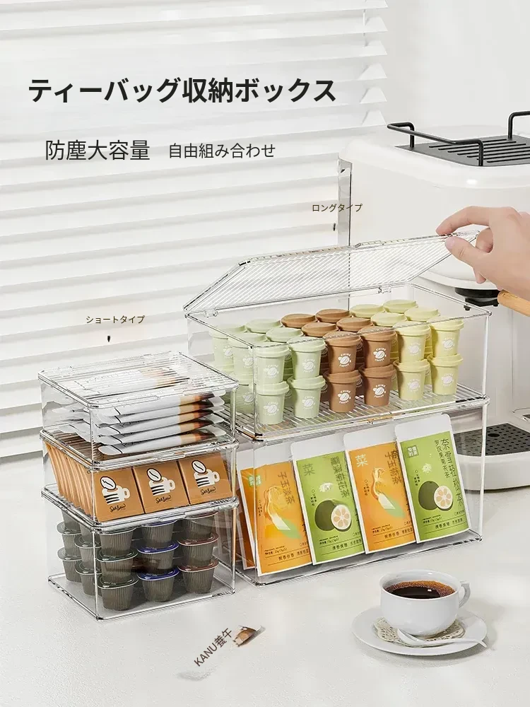 デスクトップティーバッグ収納ボックス - 透明カバー付き、スタッカブルな引き出し式、カプセルコーヒーやお茶、スナックの整理に最適!オフィスや家庭で使いやすい、スマートな収納ソリューションです。