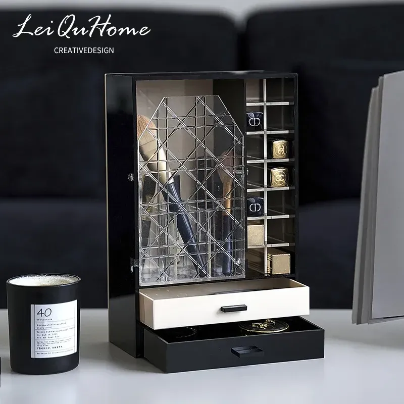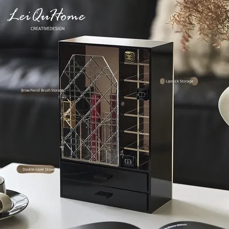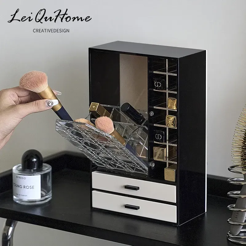 Pure Black - Makeup Brush Lipstick Holder with Two Layers of Small Drawers