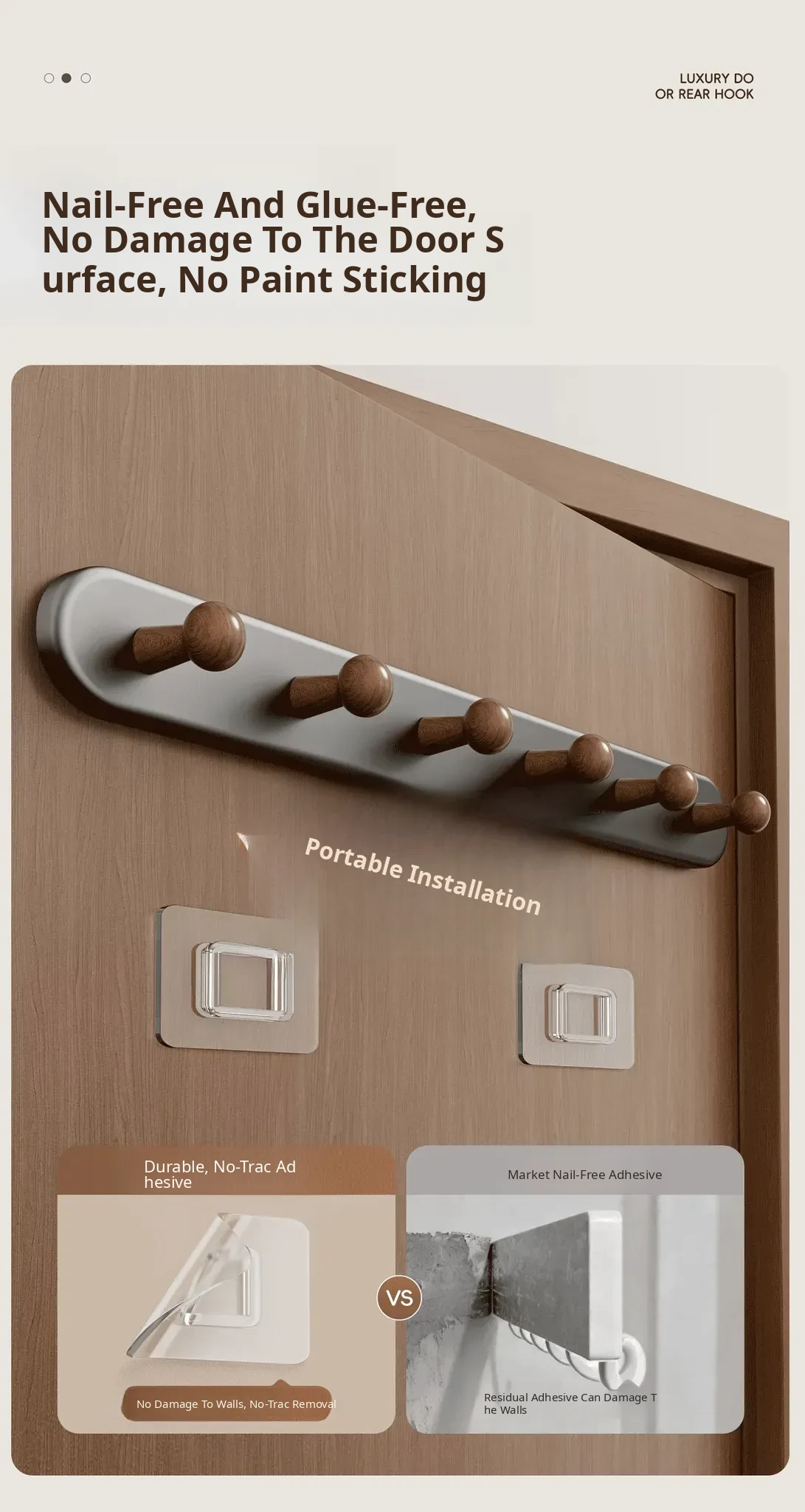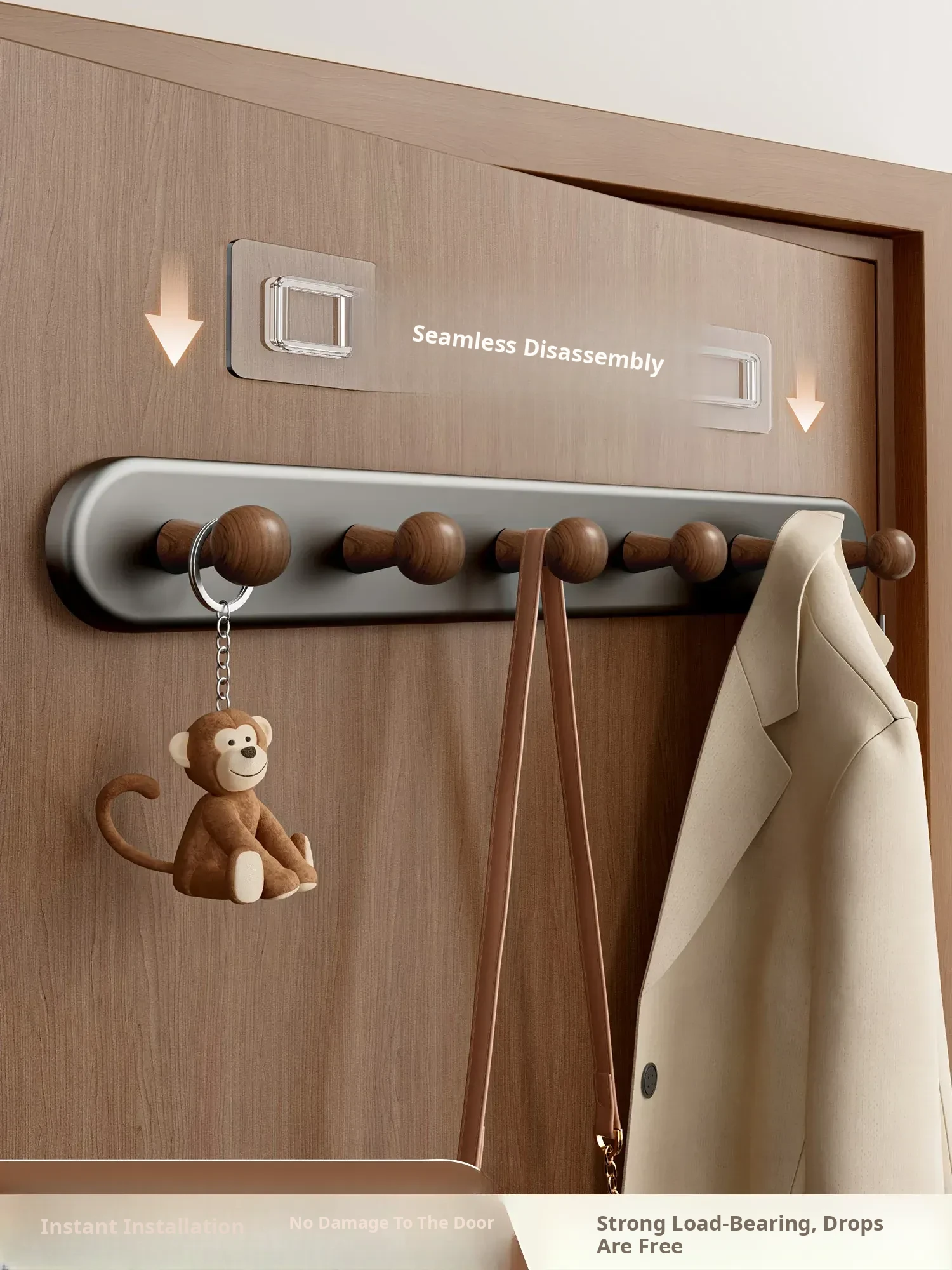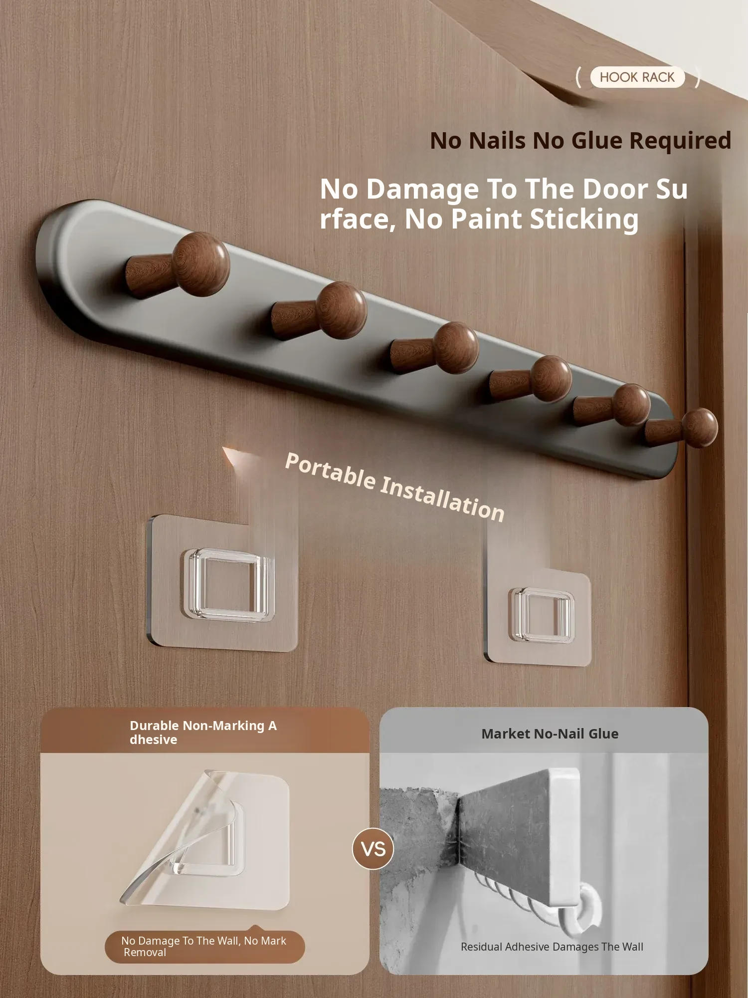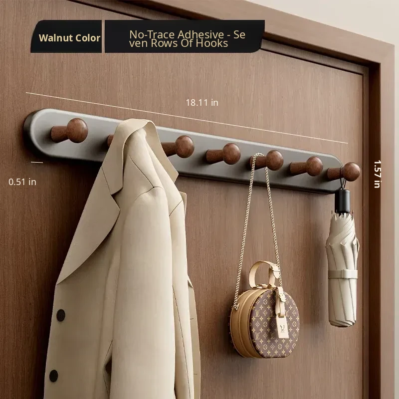 Walnut Color - Heavy Duty 7-Hook [Punch-Free/Door-Friendly] - Free if It Falls!