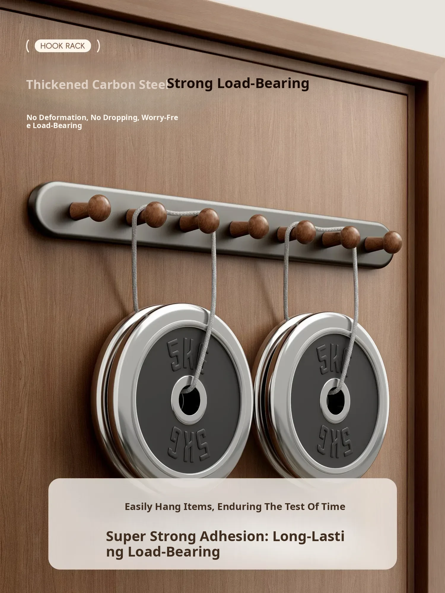 Walnut Color - Heavy Duty 5-Hook [No Drilling/Door-Friendly] - Free if It Falls!