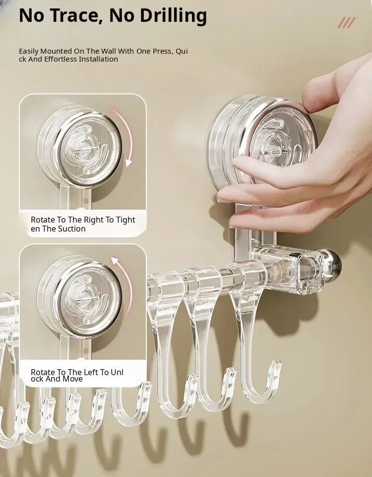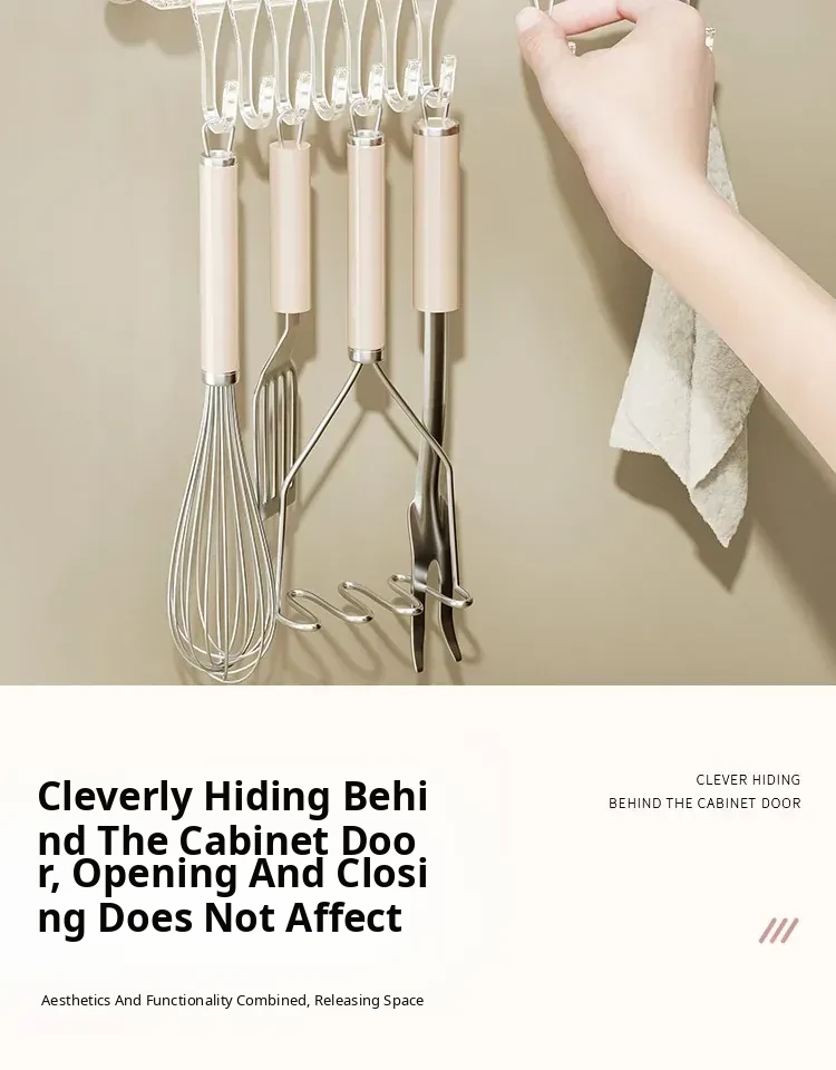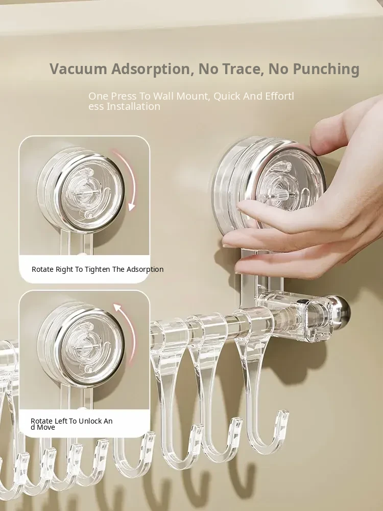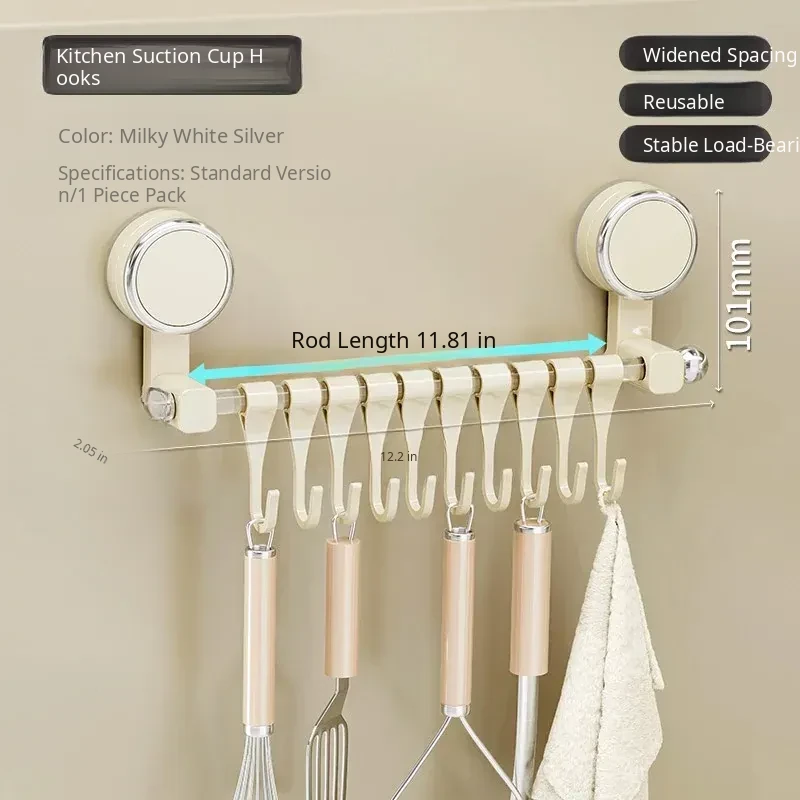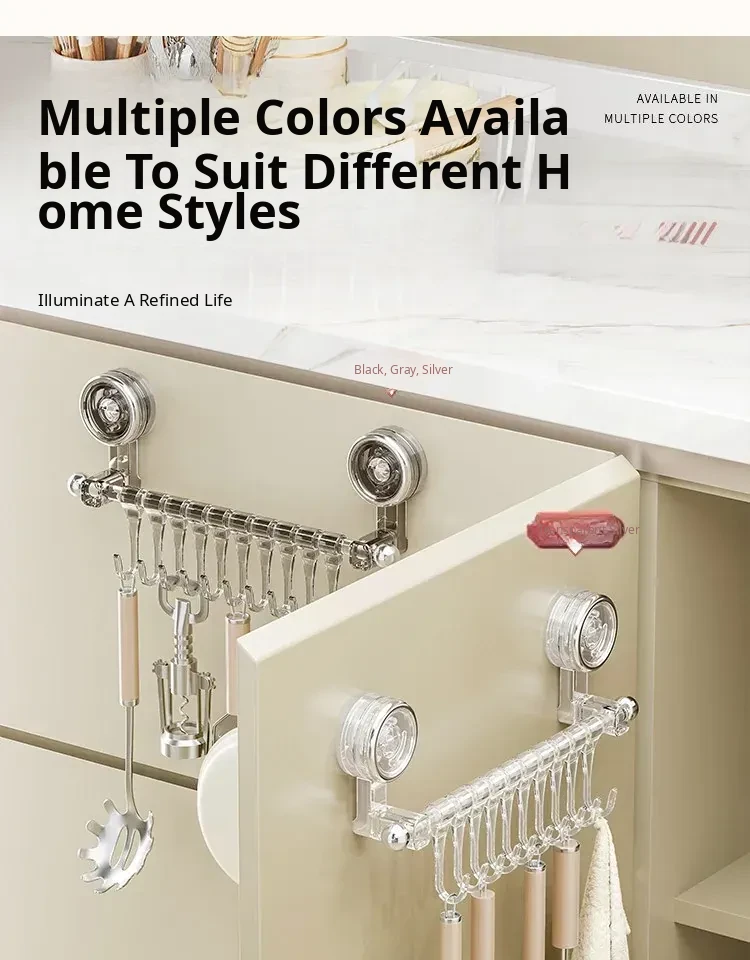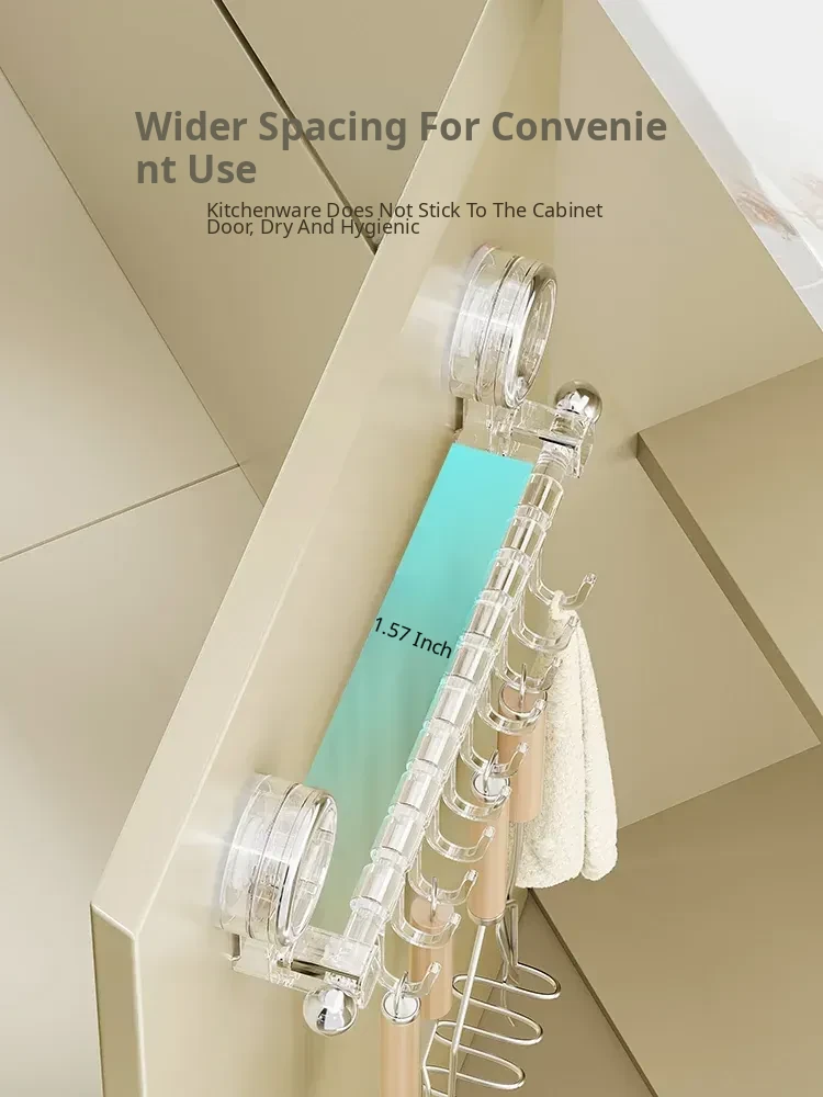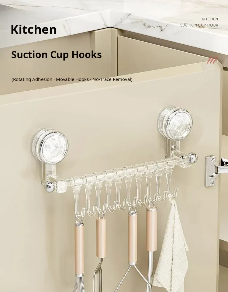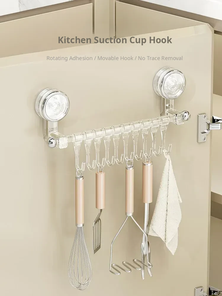 Suction Cup Kitchen Hooks - Wall-Mounted, No Drilling Required, Sliding Rail Rack for Cabinet Door, Ideal for Hanging Spoons and Spatulas, Space-Saving Organizer.