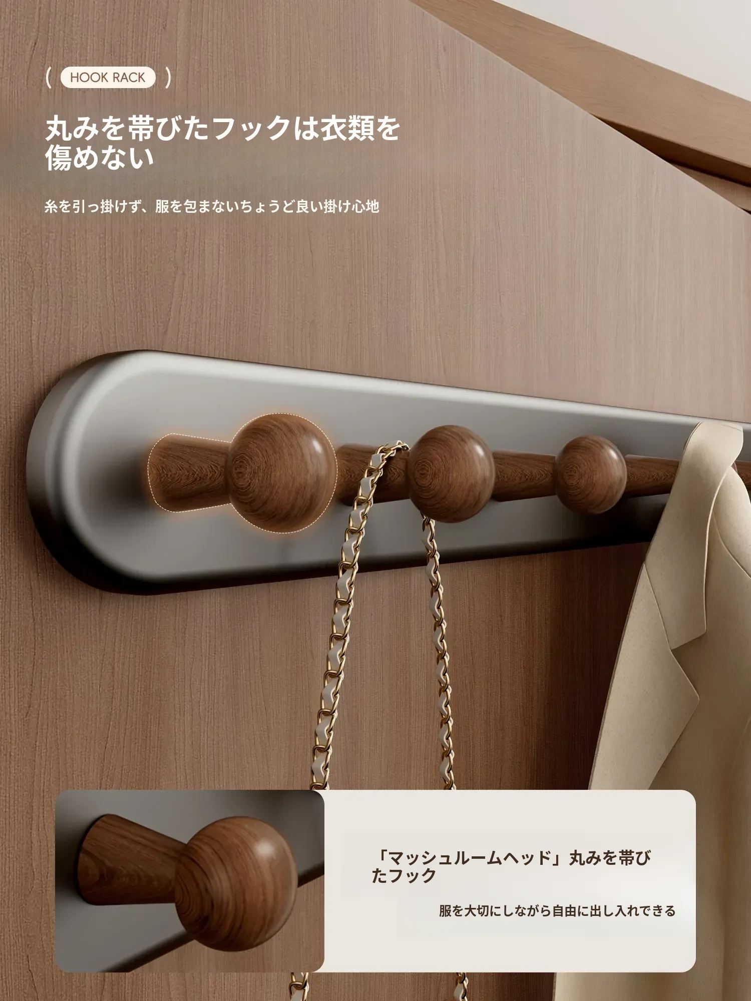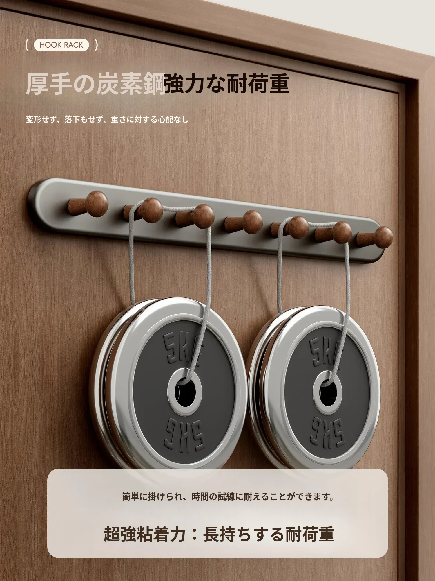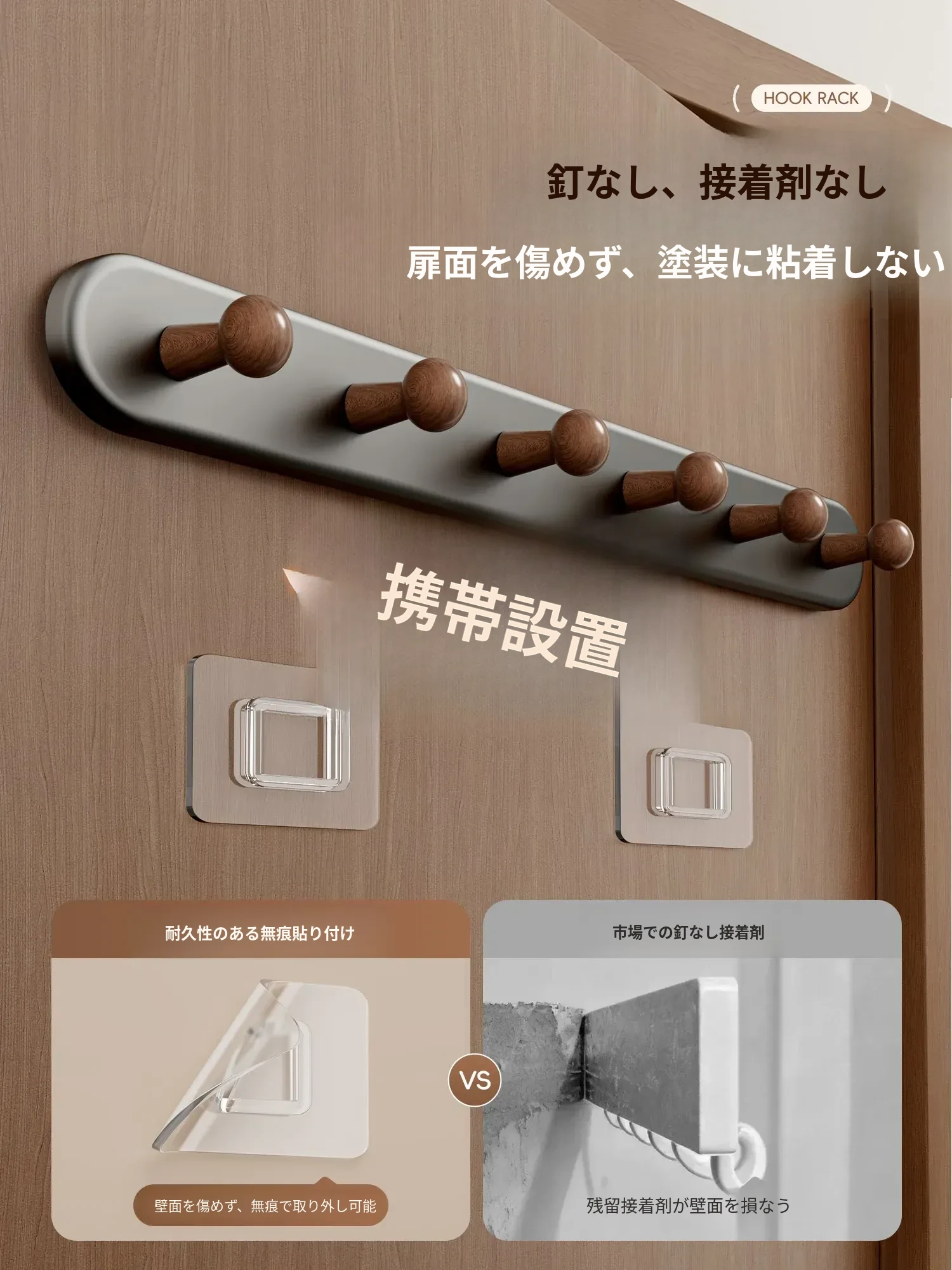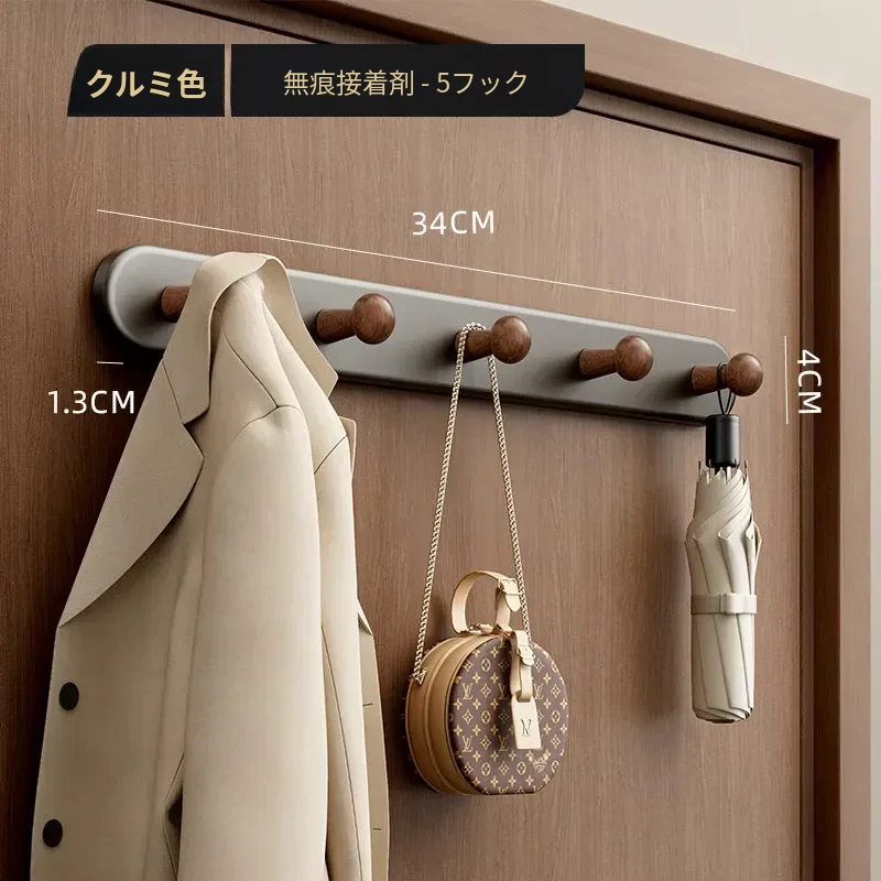 ウォールナット色-厚手5フック【穴あけ不要/ドアを傷めない】ホワイト落下プレゼント