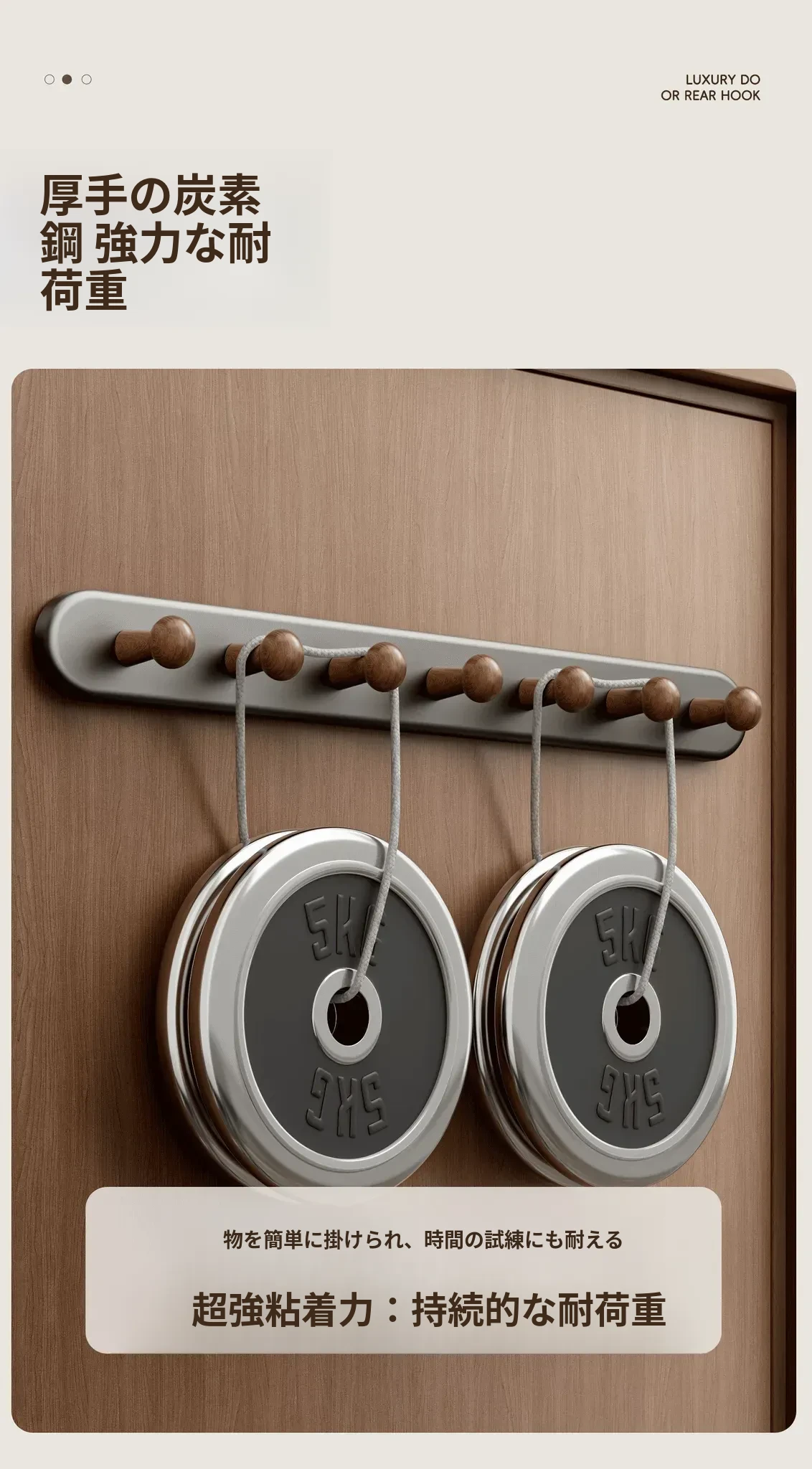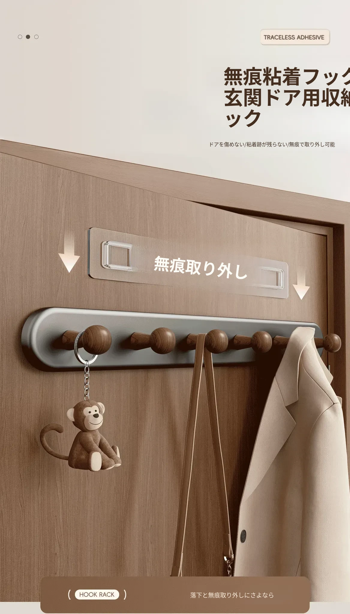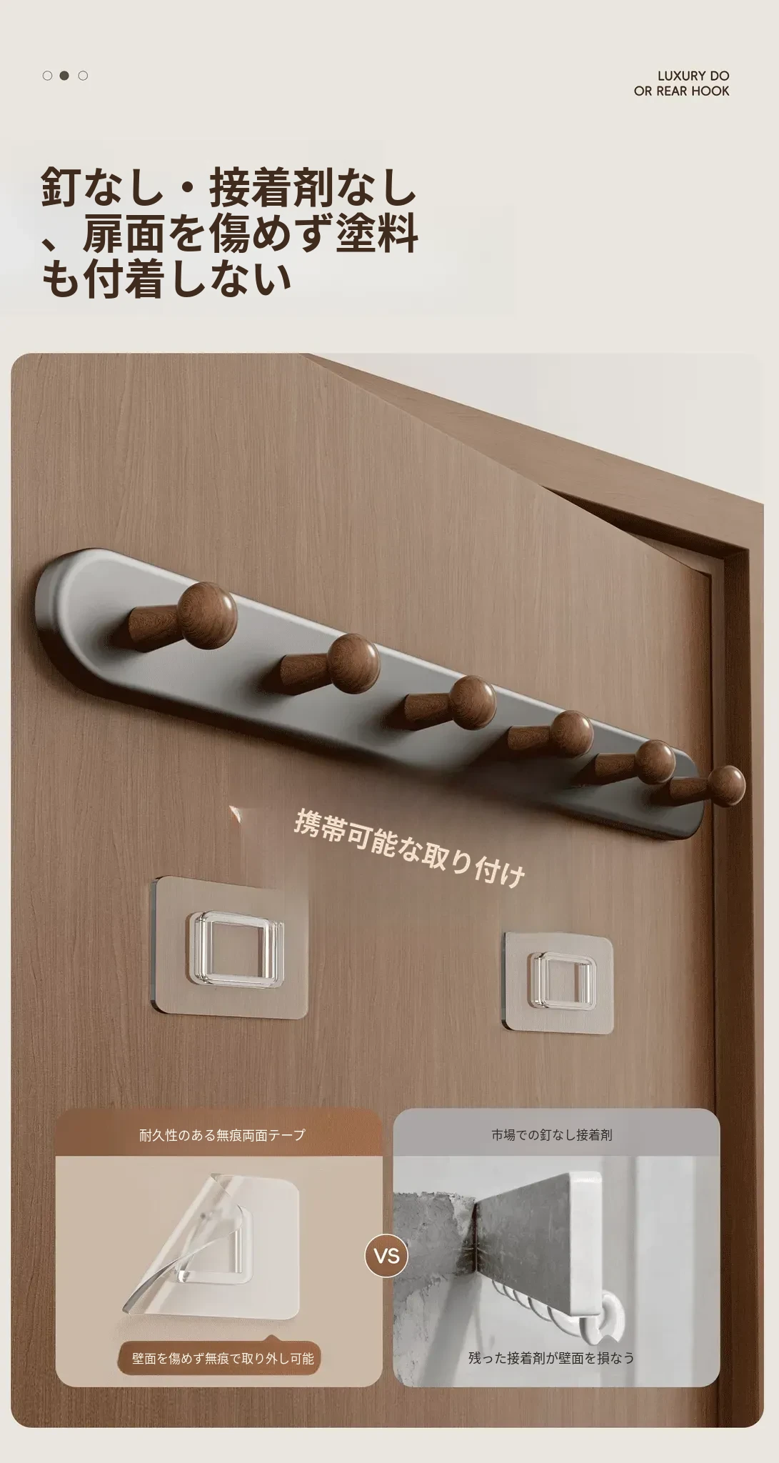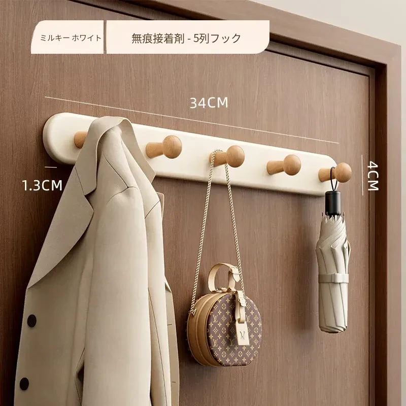 クリームホワイト-厚手5フック【穴あけ不要/ドアを傷めない】ホワイト落下プレゼント