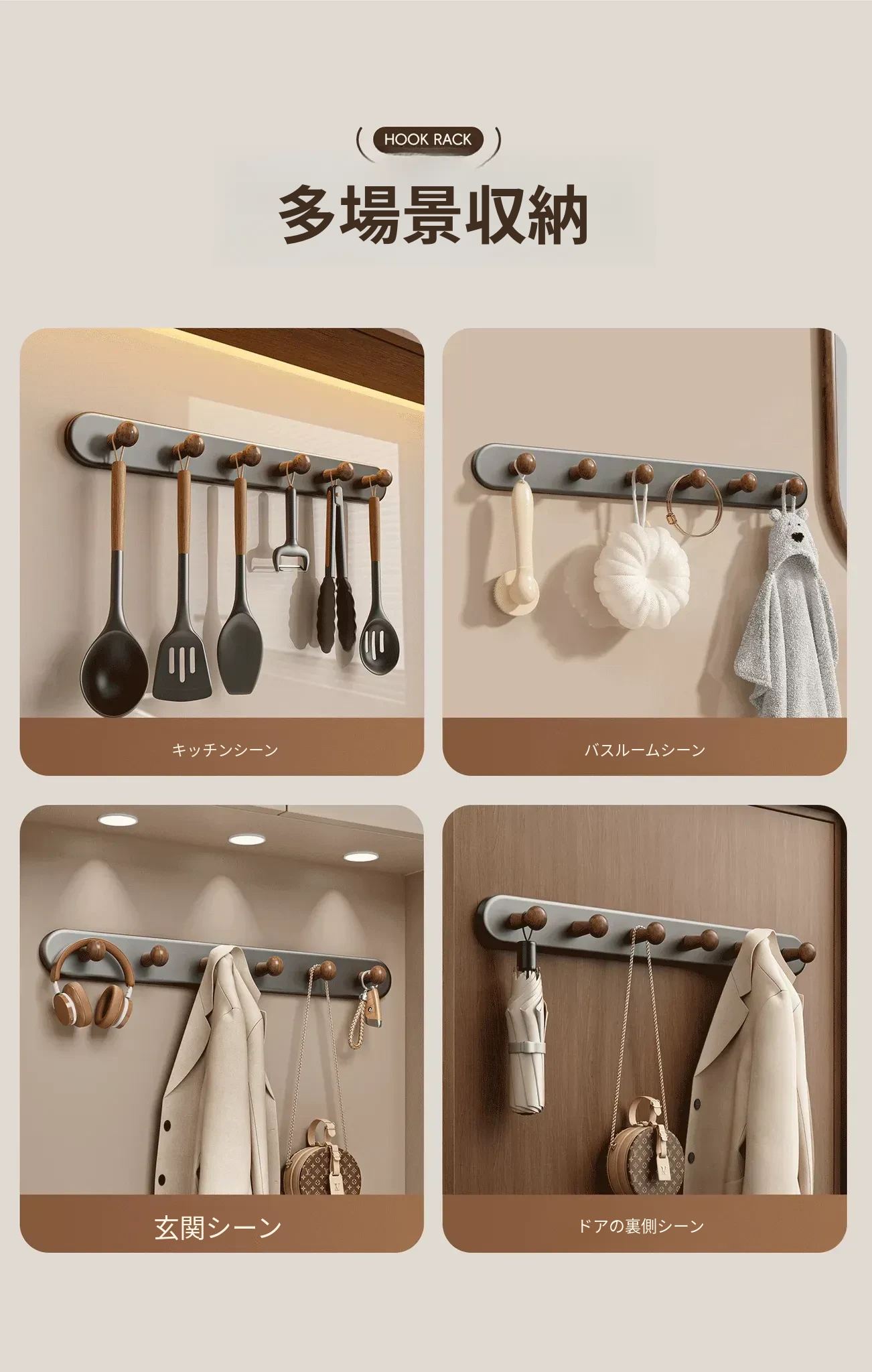 クリームホワイト-厚手7フック【穴あけ不要/ドアを傷めない】ホワイト落下プレゼント