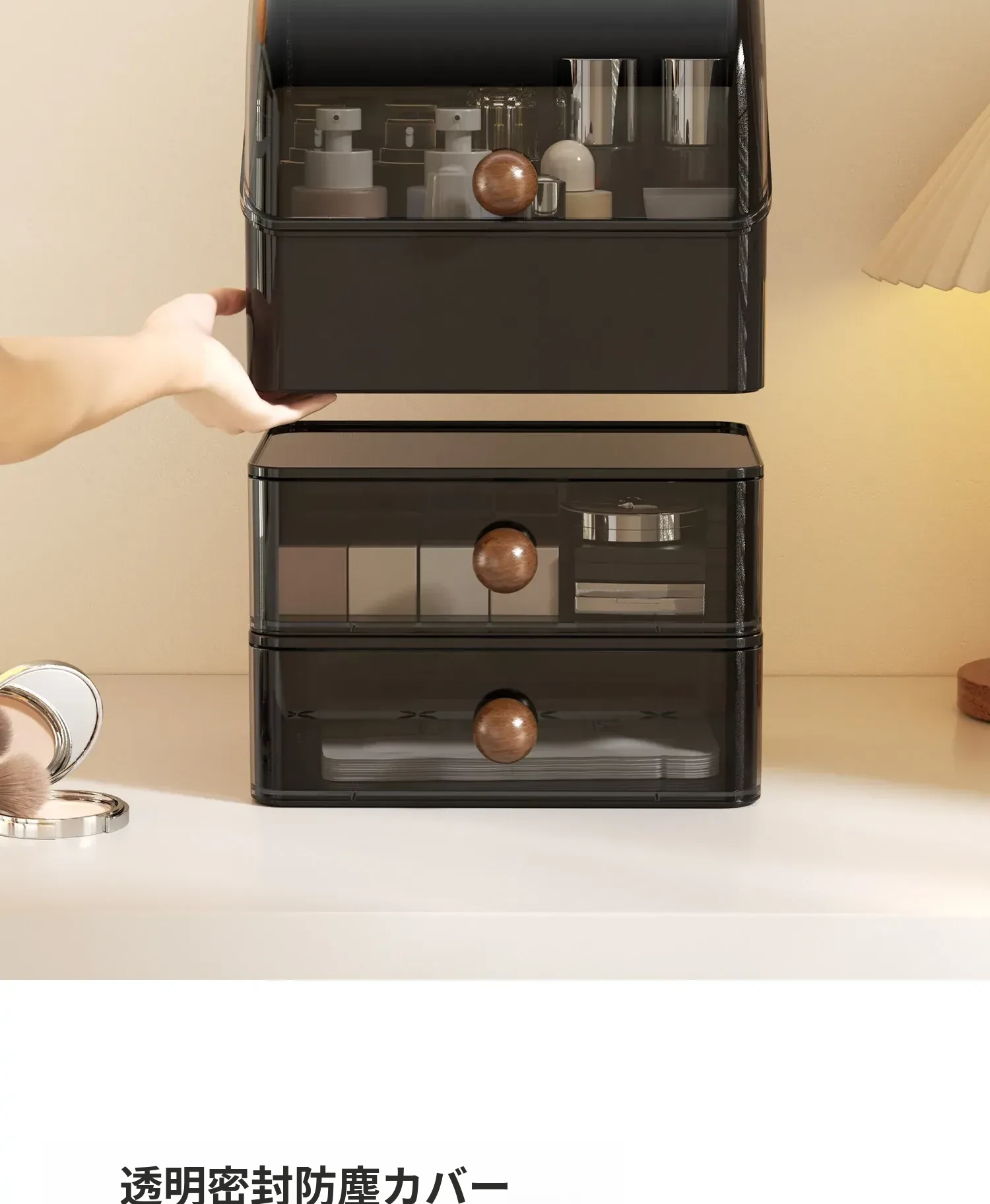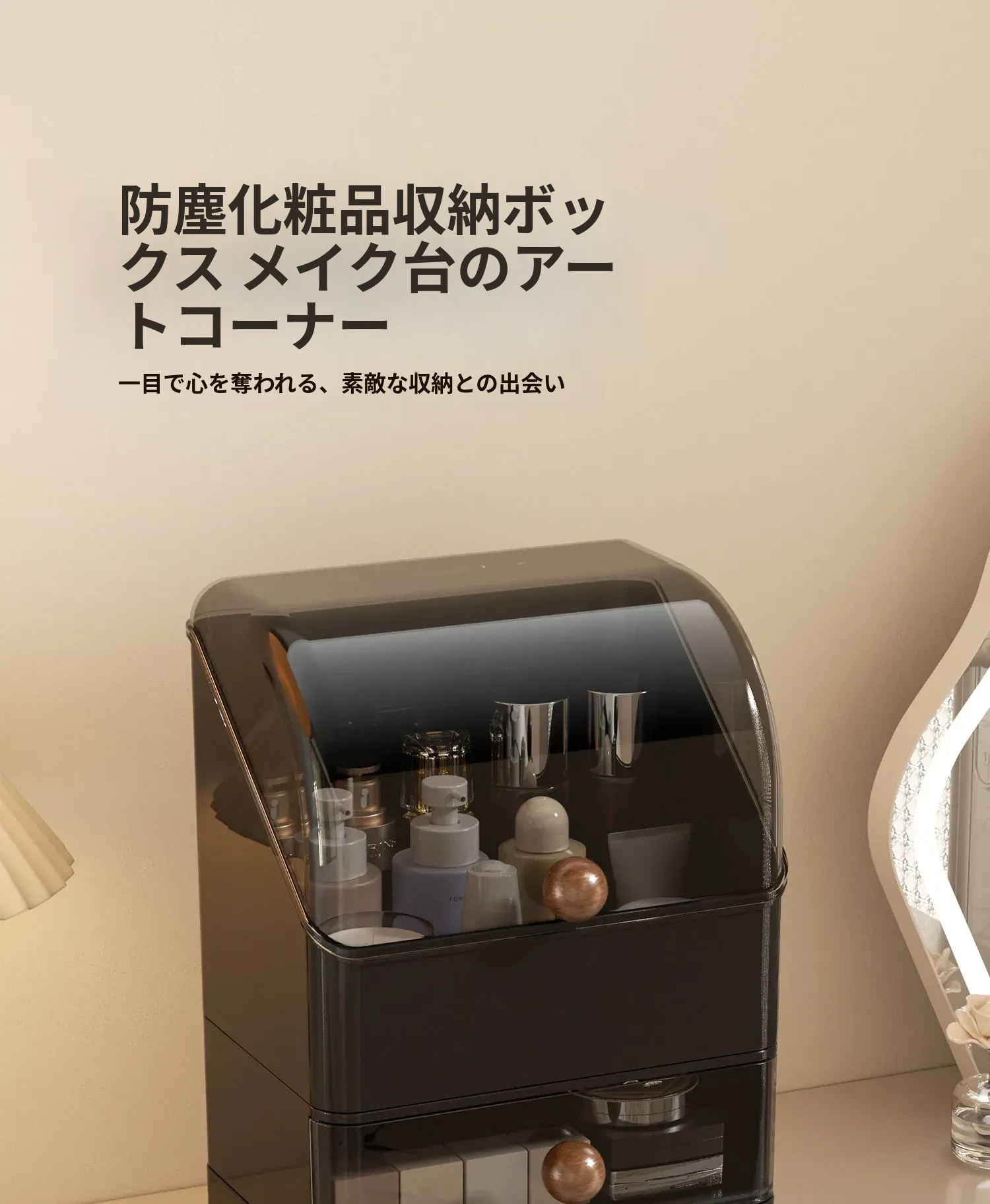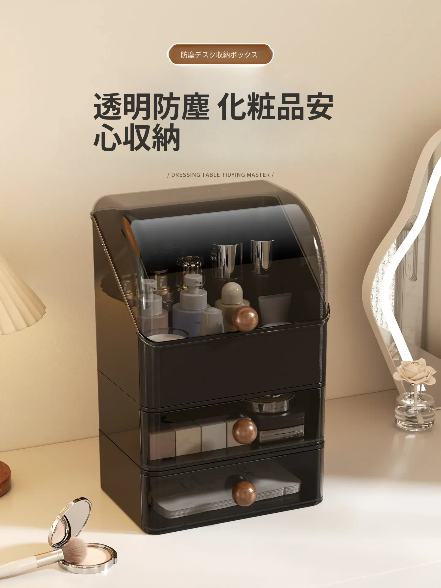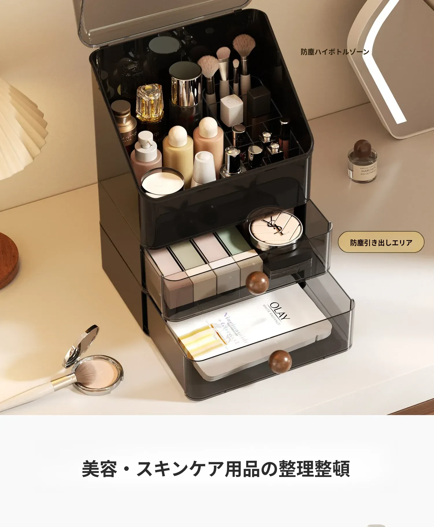 高級感あふれる大容量の化粧品収納ボックス!防塵デザインで、整理整頓も簡単。分格抽斗式で、スキンケアアイテムもすっきり収納。あなたのビューティースペースを格上げするアイテムです!