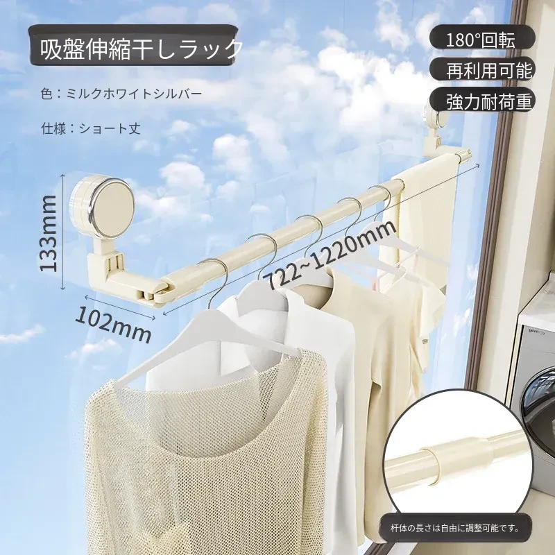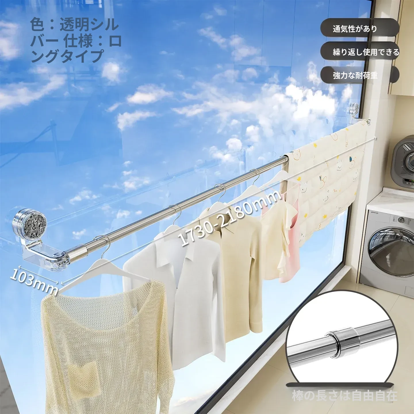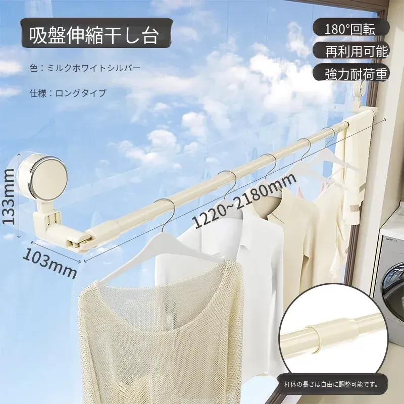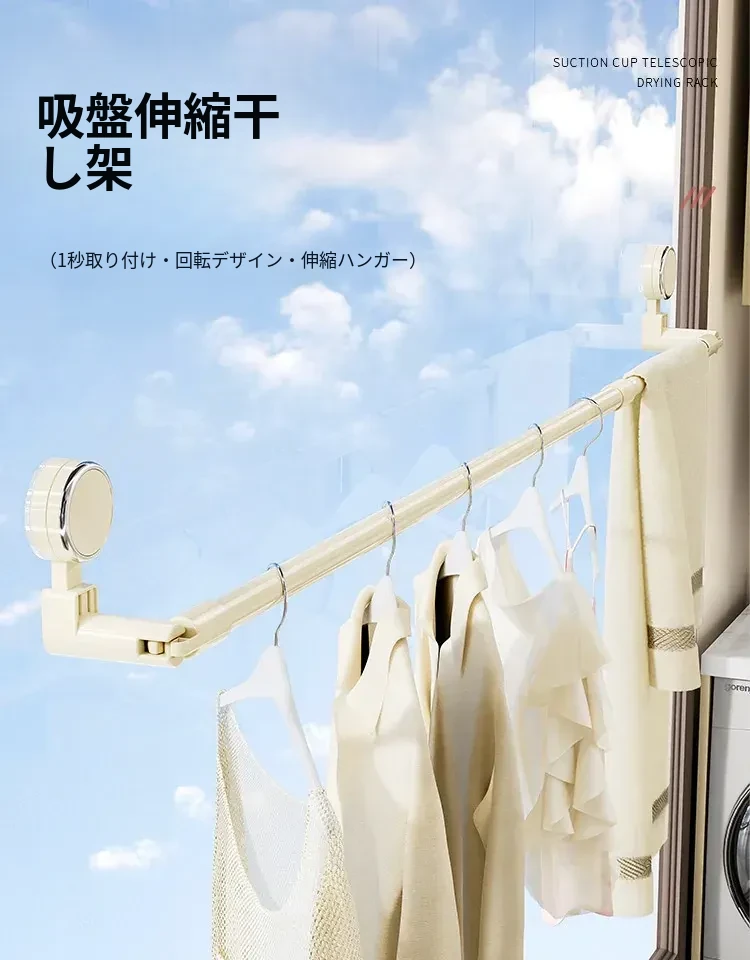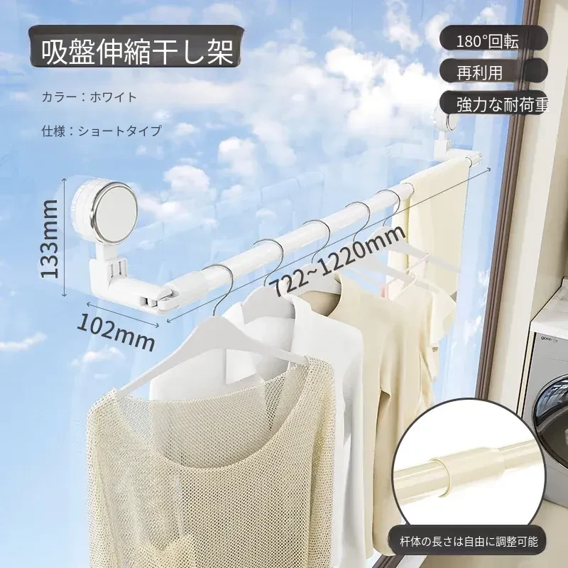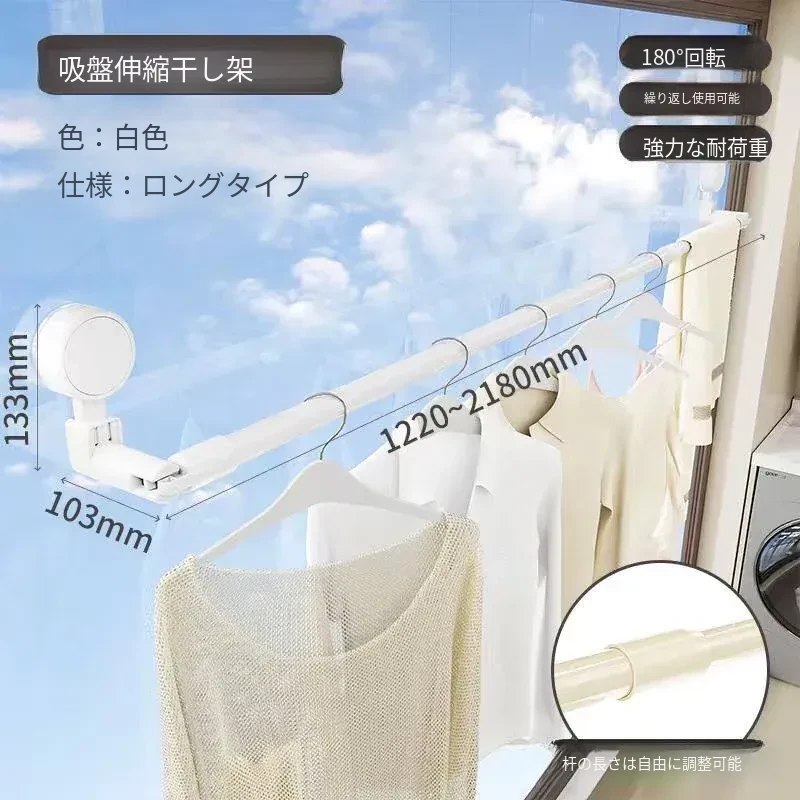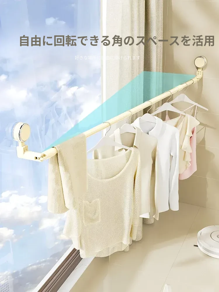 吸盤式回転衣類干しラック - 壁に穴を開けずに簡単取り付け!家庭用、無痕で窓やバルコニーに最適。伸縮可能でスペースを有効活用!あなたの生活をもっと便利にする必需品!