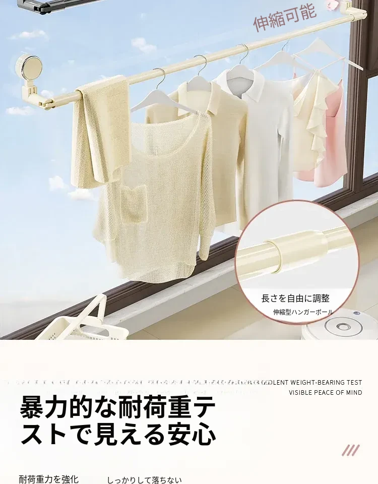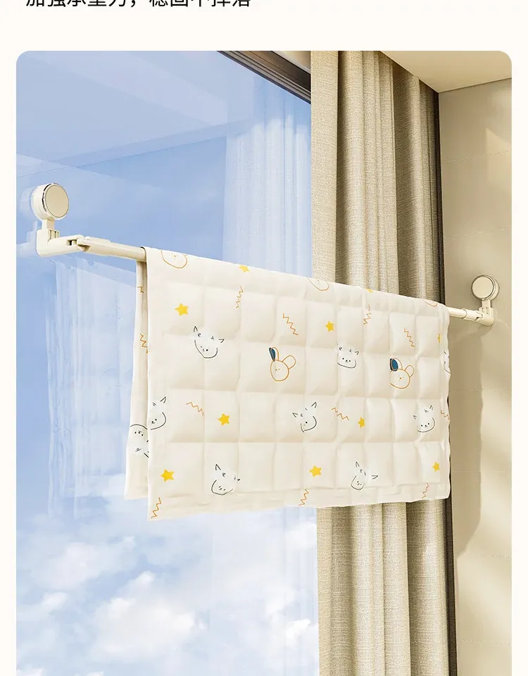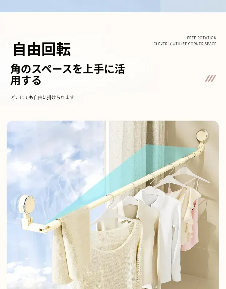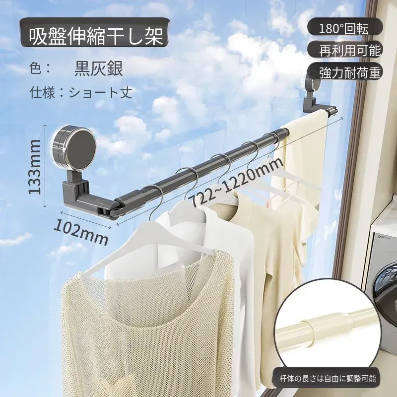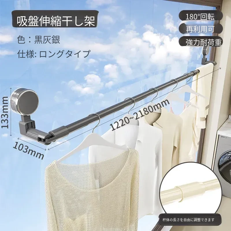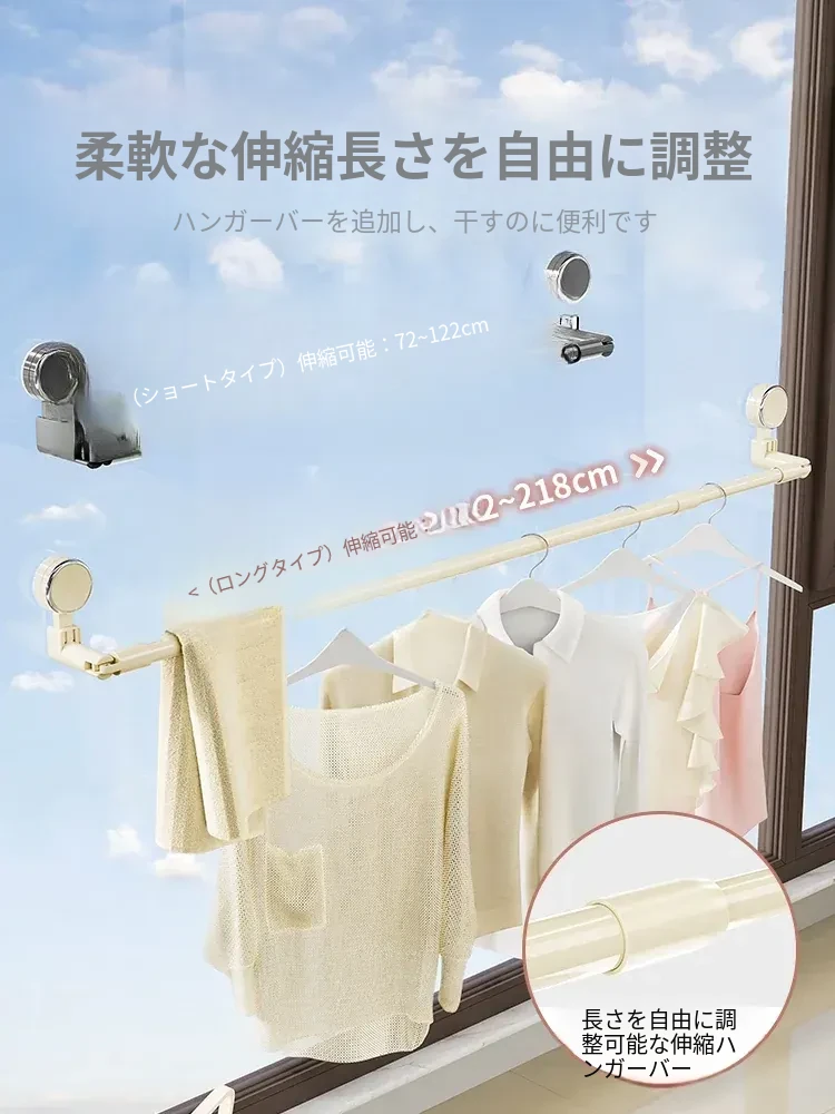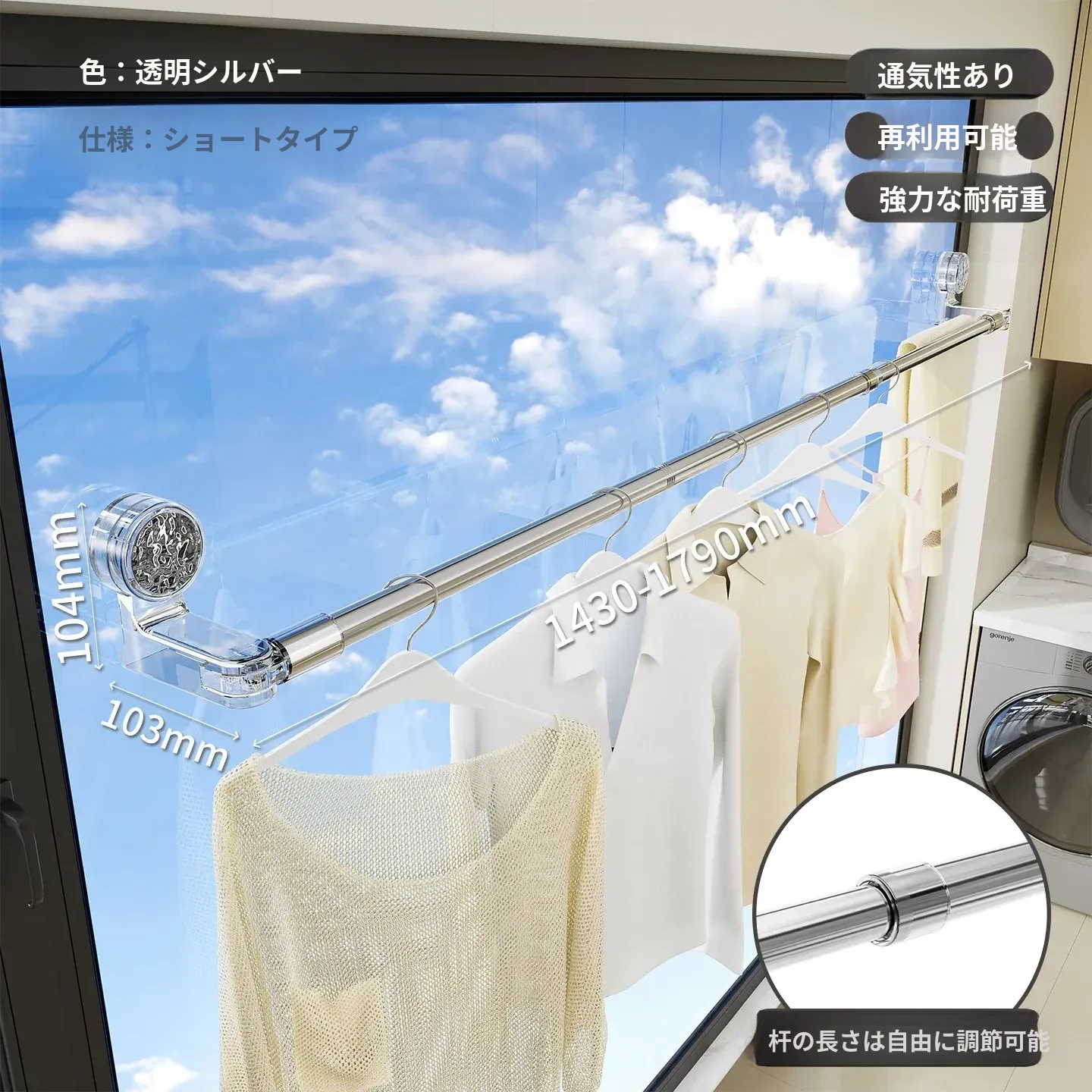 吸盤式回転衣類干しラック - 壁に穴を開けずに簡単取り付け!家庭用、無痕で窓やバルコニーに最適。伸縮可能でスペースを有効活用!あなたの生活をもっと便利にする必需品!