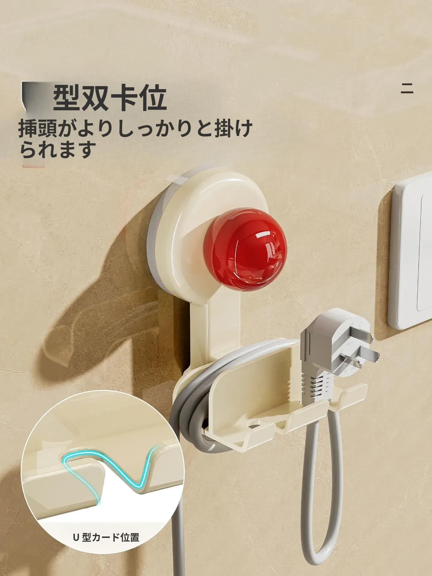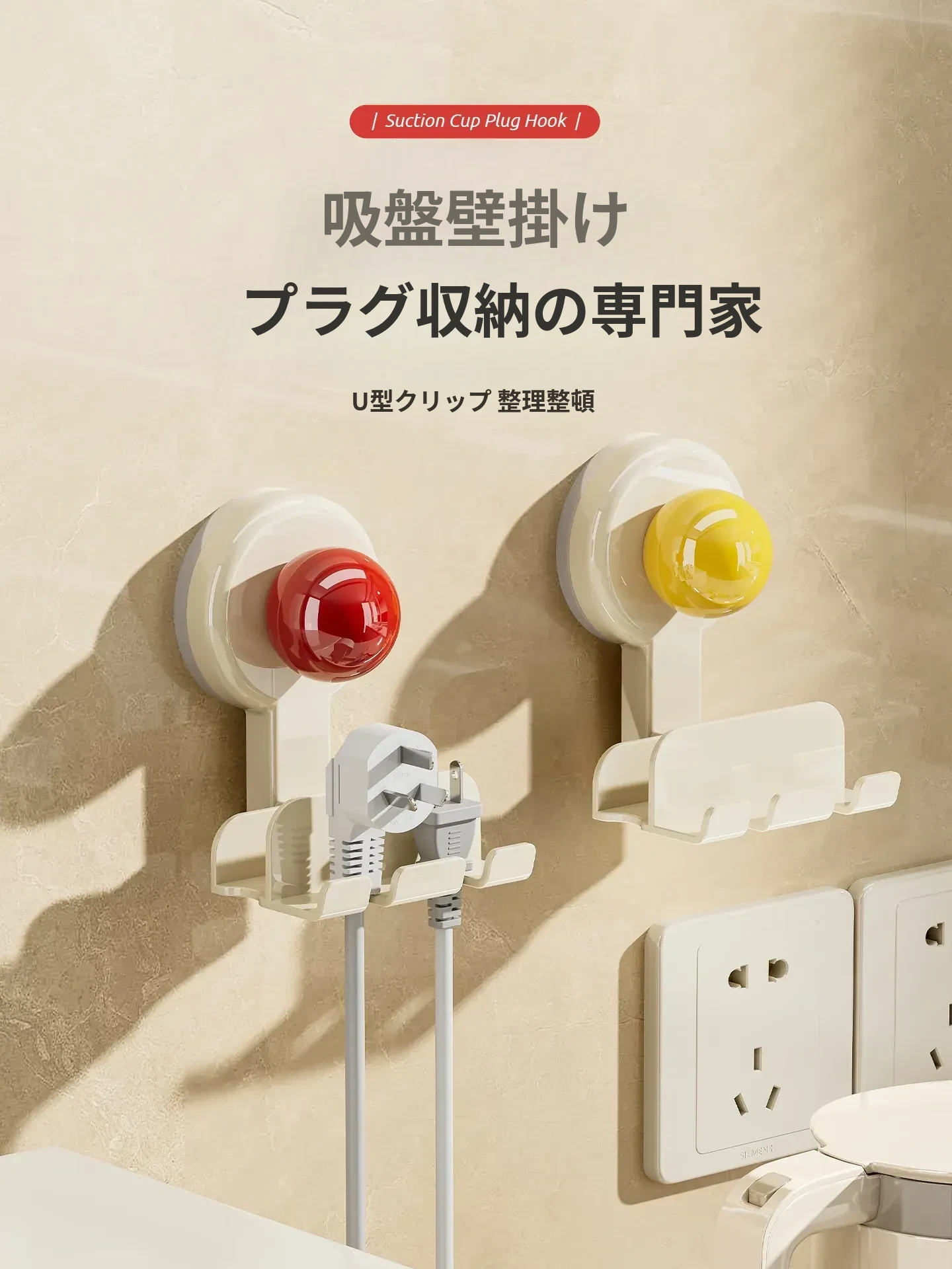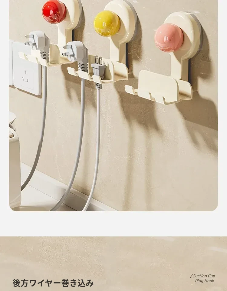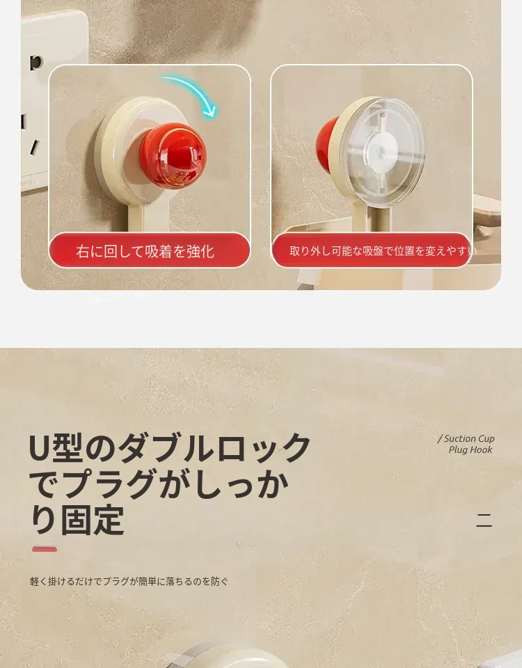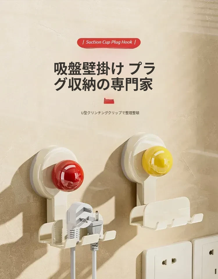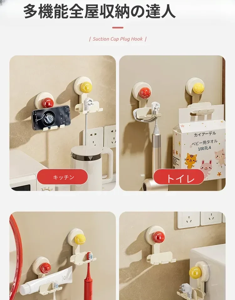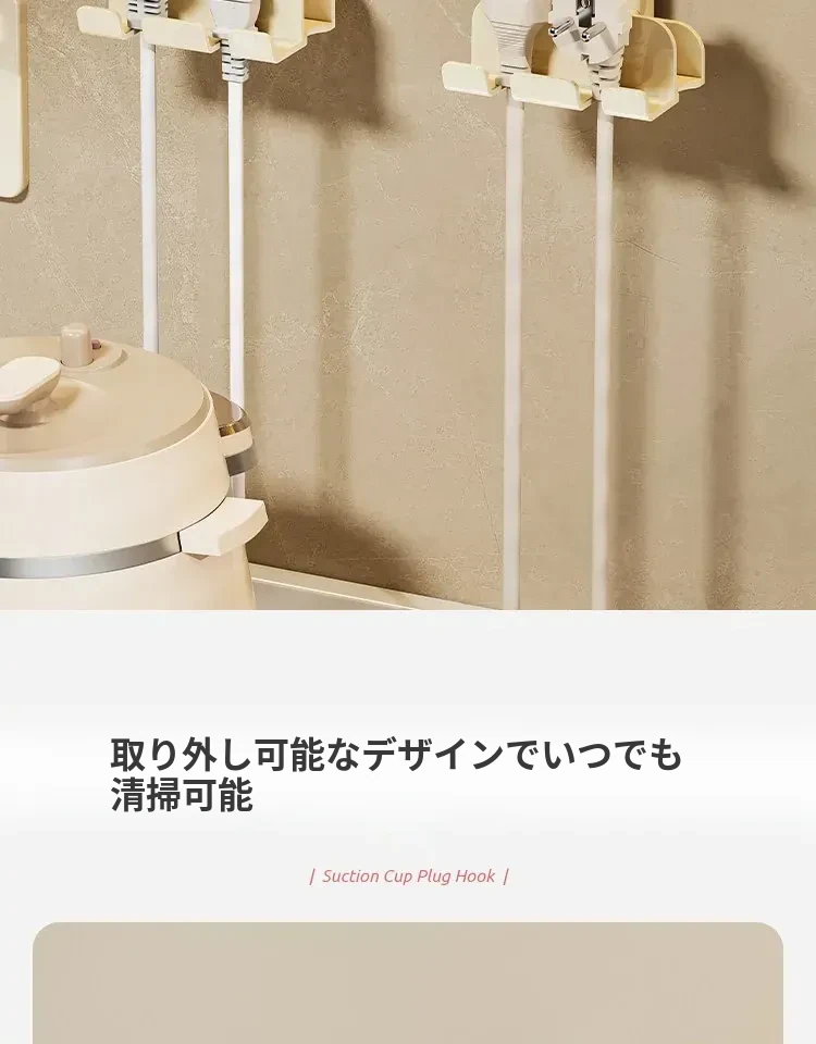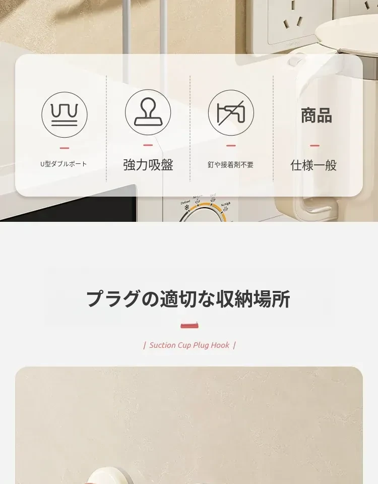 吸盤式プラグ固定器 壁掛けタイプ 取り付け不要の収納便利グッズ キッチン家電の電源コードをしっかり固定するフックで、配線をスッキリ整理!